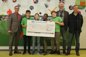 Im Bild (von links): Vorstand der Raiffeisenbank Herr Falk, vier Schüler der Melibokusschule, Schulleiter Herr Volkart und Schulsportleiter Herr Schorr.